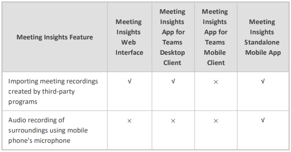 not provided by Meeting Insights Teams app:- ✔ Importing meeting recordings created by third-party programs